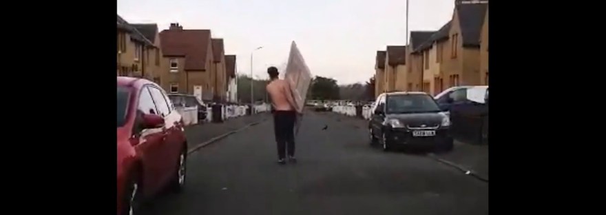 It was set in Blantyre in South Lanarkshire in Scotland. Us Scots don’t do cute kittens or celebrity spotting, no we do a guy with only a pair of joggers on, walking down the middle of the road, carrying a door.