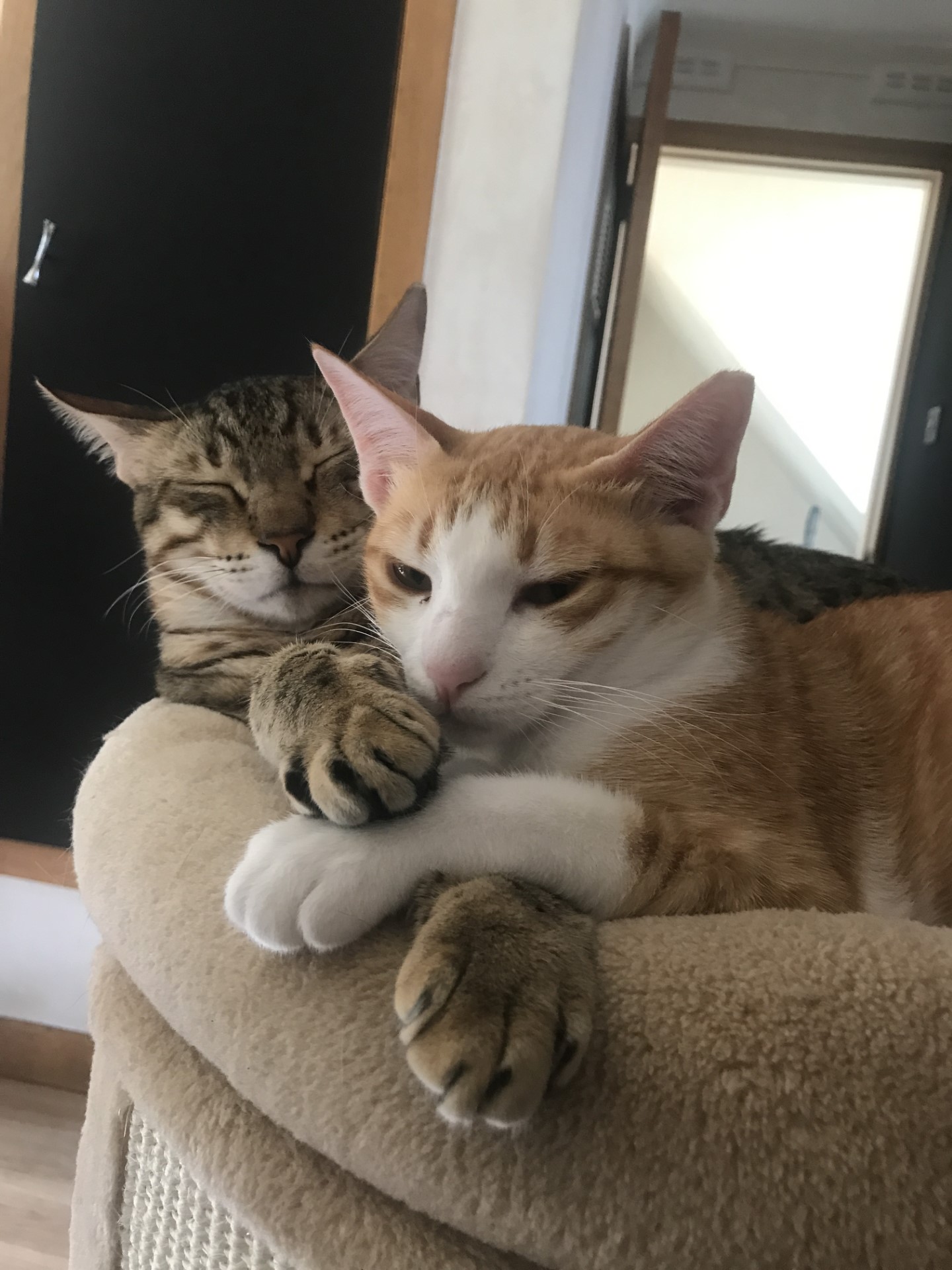 The wee orange one started off being named ‘Haanah’ by the lovely lady who saved her. We wanted to call her Penny Dreadful (PD is very apt for a cat!) but Gwen calls her ‘Bitey’ as she bites. I just call her ‘Wee Fiend’. The big one is still more or less called Haary, that he was named by the rescuer but I do call him ‘Pussybawz’ and ‘Princess Bawz’ cause he is a bit of a coward and a diva.