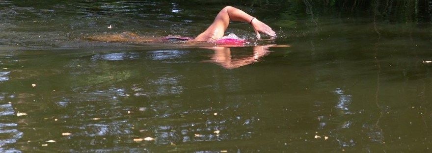 Image by Kev from Pixabay – swimmer in wild water with red swim hat and really grubby looking water.