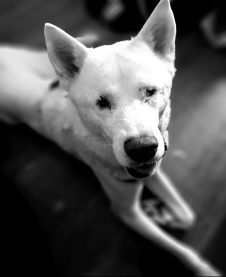 Image: From the author. White wolf type dog lying down and looking at the camera.