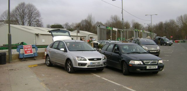 Image Robin Stott / Recycling Centre, Prince’s Drive, Leamington Spa from Wikicommons. A recycling tip with cars parked alongside bins and a metal building in the background.