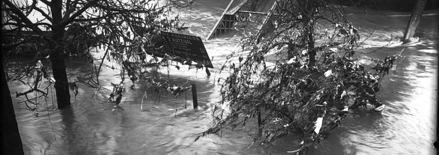 Image: Bibliothèque nationale de France, Public domain, via Wikimedia Commons – Flooded city street in black and white with submerged trees and damaged infrastructure