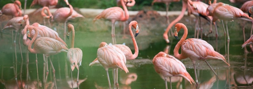 Image by Myo Min Kyaw from Pixabay – a flamboyancy of flamingos reflected in calm water.