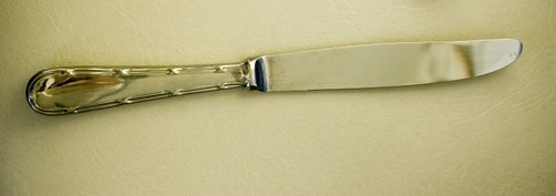 Image: a silver butter knife with an ornate handle on a beige background. from https://www.freeimages.com/