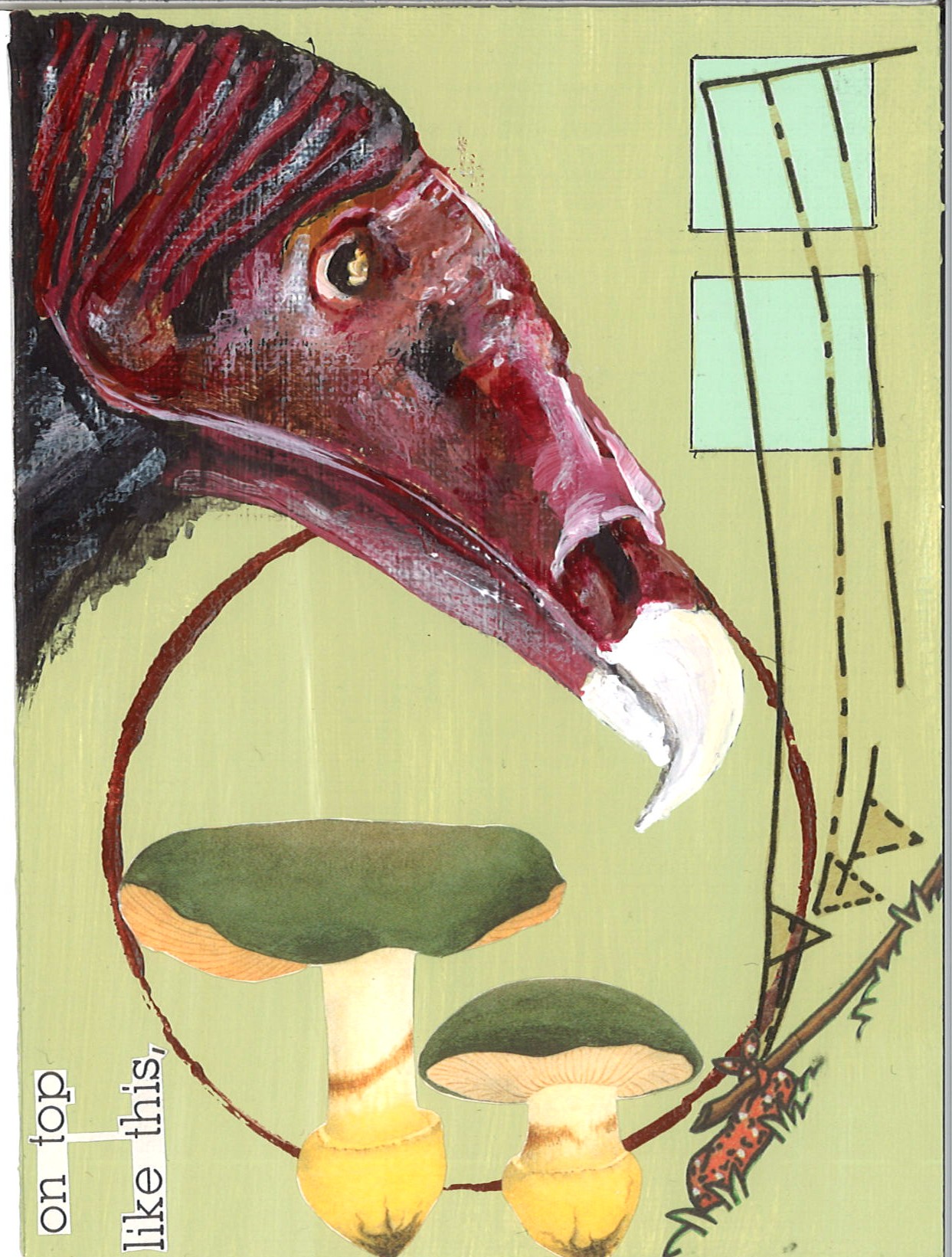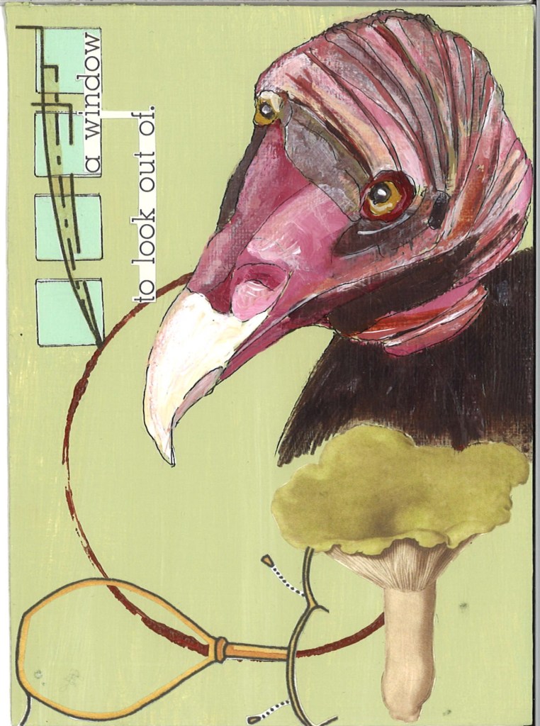 turkey vulture portraits: i’m currently in a small town in southeastern colorado to which turkey vultures migrate and roost. it’s always an honor and thrill to see them gliding in thermals overhead or roosting in dead cottonwood trees during my daily morning walk in central park. i tend to paint them when this happens because they serve a significant purpose in nature’s cycles by eating, and thereby cleaning up carrion. i want to pay homage to this function of theirs, and to sort of forgive myself because i often, though as often unintentionally, function as a catalyst in others’ lives: a sort of lancing-the-boil-to-release-the-toxins-and-clean-things-out effect.