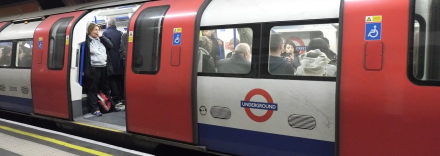 Image: London Underground train full of travellers from pixabay.com. A red and white train with the doors open and lots of passengers inside.