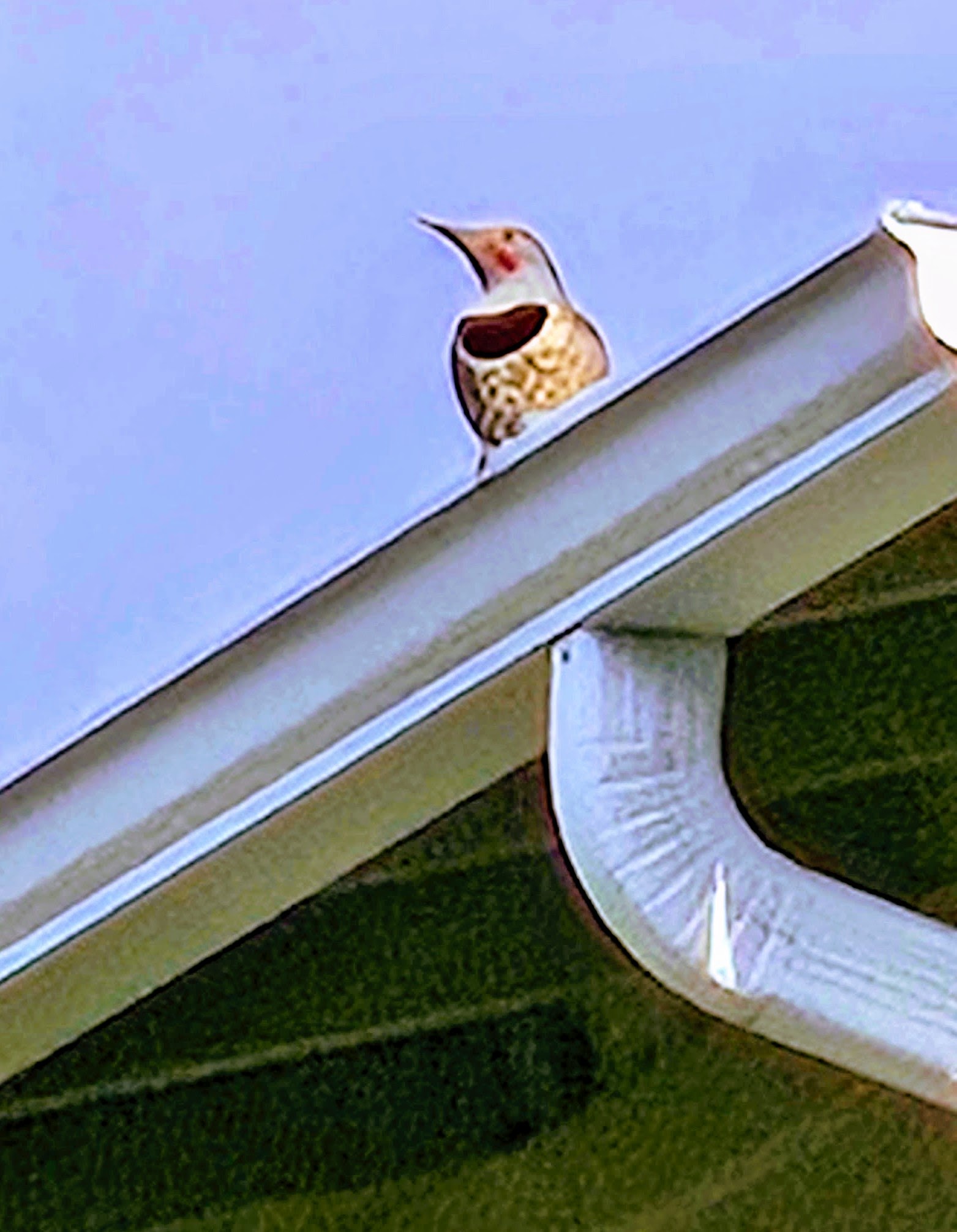 And this guy (just down the road from Mr. Beeker) is a Northern Flicker Woodpecker. I call him Big Ed. At the time of the picture, he was up there jack-hammering the metal gutter to let the lady Flickers know that Big Ed is back in town and he’s ready to experience the miracle of love. He is a bird of perhaps false bravado. Anyone who has not heard a Woodpecker drum on a gutter or chimney cap, I can tell you it is hell loud. Football helmet designers should pattern their wares after the unknockoutable noggin of the Woodpecker.