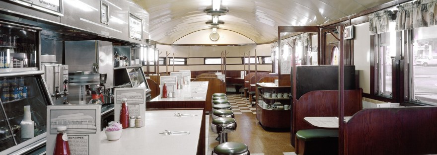 Iage: American Diner interiro with bar stools at a counter set with sauce bottles and menus and booths against the wall of windows from pixabay.com